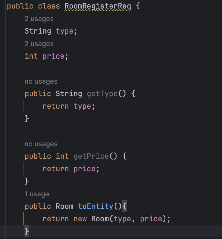 그리고, 방을 저장하는 거지 방을 생성하는 건 아닌데 그 코드까지 있어야 하는가?에 대한 의문증,,,즉, service가 할일이 너무 많음!=>DTO로 코드 이동하자