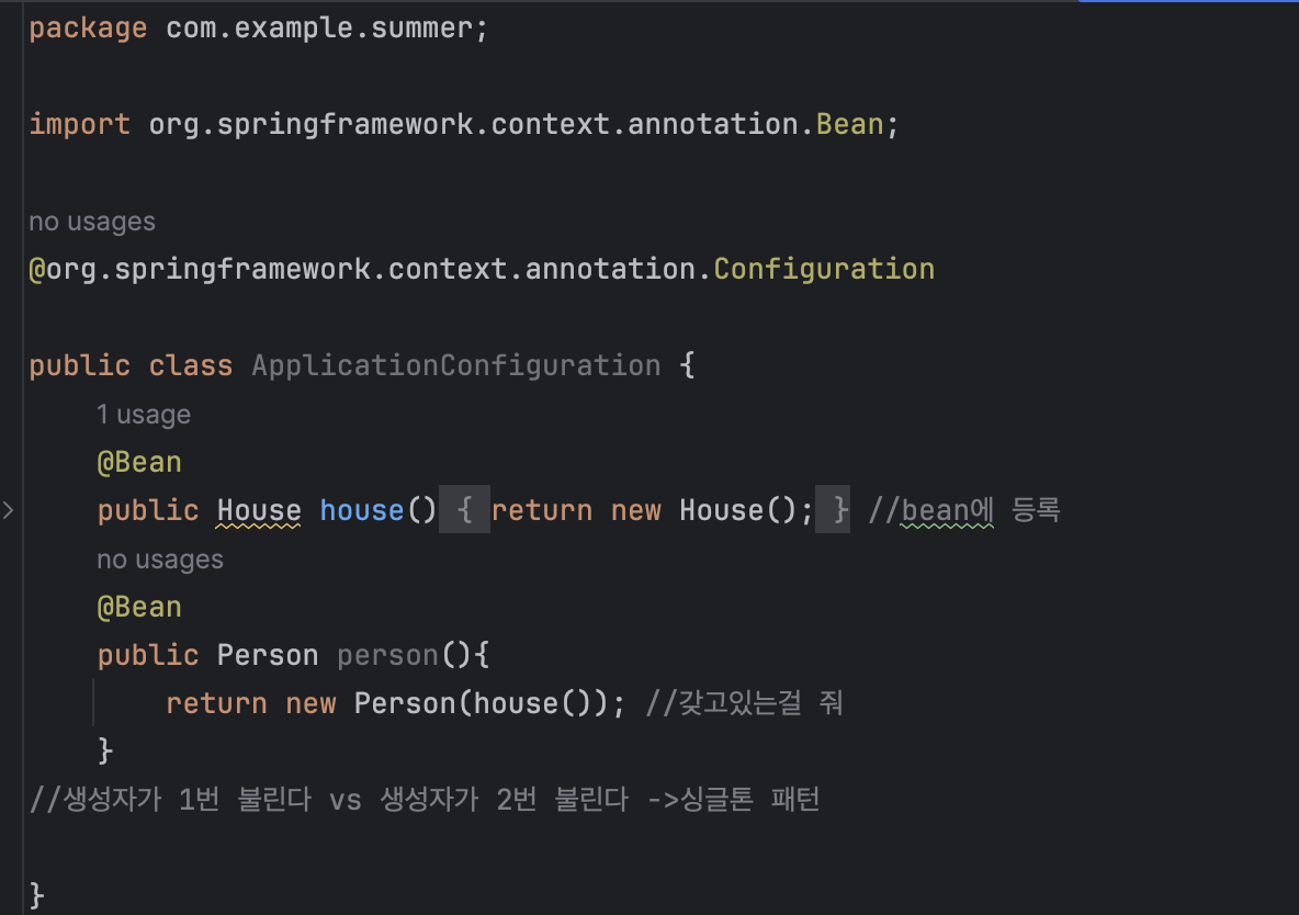 객체를 반환하는 메소드 위에 @Bean을 달면 반환되는 객체를 컨테이너에 등록하게 된다!!