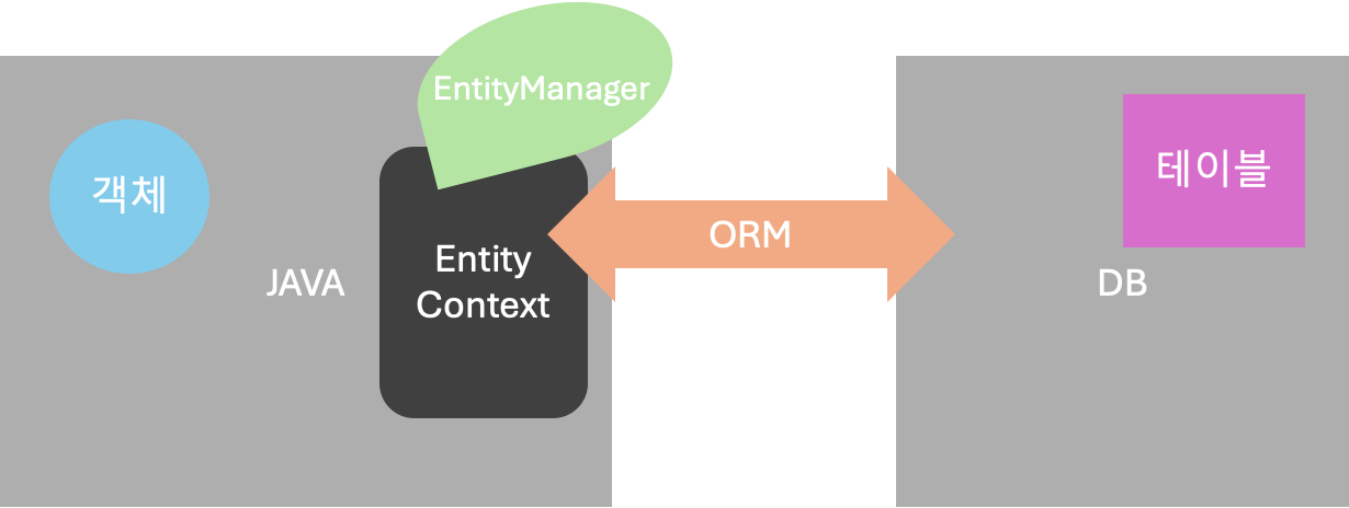 자바와 DB사이(정확히는 자바 끄트머리)에 엔터티 컨텍스트가 있고, 둘 사이를 데이터가 왔다 갔다하려면, 엔터티 컨텍스트에 꼭 들렸다 와야한다.