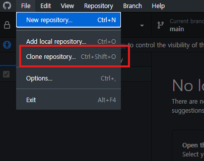 Github Desktop에서 File > Clone repository 해서 내 계정에 fork된 저장소를 로컬로 가져온다.