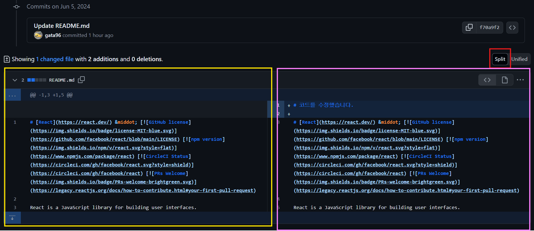 Split을 누르면 수정 전과 후의 코드를 비교할 수 있다.