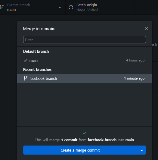 origin(main branch)를 current branch로 띄워두고, merge하려는 branch를 클린한다.