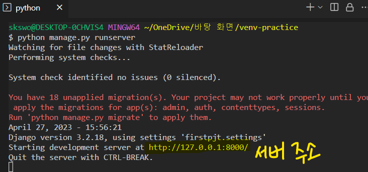 - runserver 명령어는 manage.py 파일이 있는 경로에서 실행을 해줘야한다.