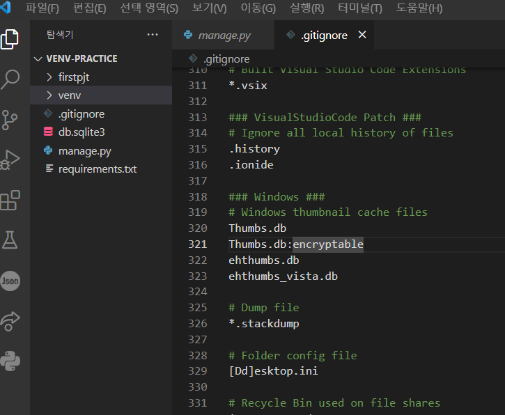 - git status해서 첫 commit해야할 파일들을 보면 venv 파일이 안보인다.