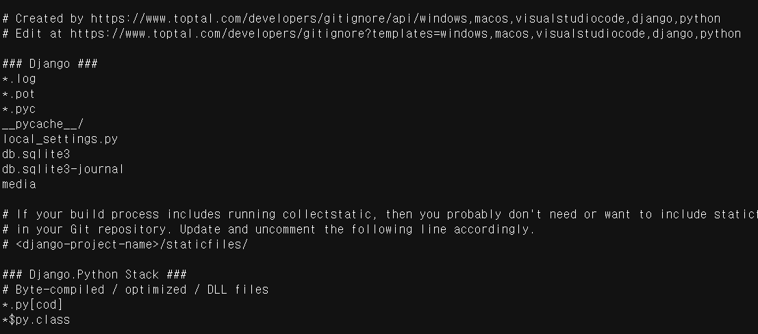 - 사용하고 있는 운영체제, 개발환경, 프로그래밍 언어, 프레임워크에 맞게 .gitignore 파일을 만들어준다.