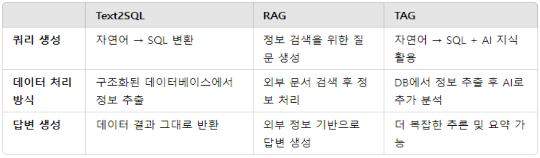 TAG는 Text2SQL과 RAG 방식의 한계를 극복하며, 데이터베이스와 AI 언어 모델의 협업을 강화하는 방식이다.