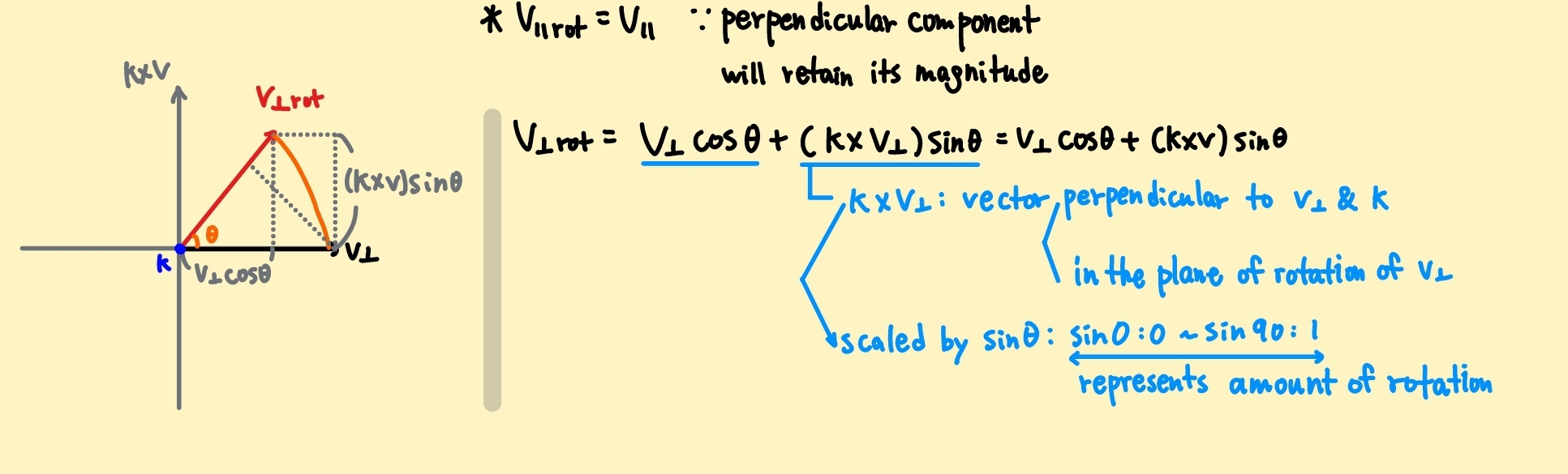 - 그리고, 나머지 변은 k와 v(또는 v 직교 벡터)의 외적 값과 sin값의 곱이다. 외적 벡터는 k, v 벡터와 수직이면서 v 직교 벡터가 회전하는 면에 종속되어 있다. 외적 벡터에 v 직교 rot 벡터가 회전하는 정도를 표현(scaling)하는 sin값을 곱해서 구할 수 있다.