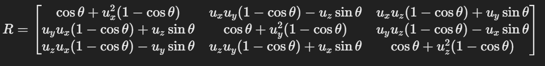 - 이 공식의 유도식을 정리하겠다고 마음 먹게 된 계기는 사소했다. OpenGL API로 모델 뷰어에 들어갈 커스텀 수학 라이브러리를 짜고 있는데, 회전 행렬을 연산하는 함수의 레퍼런스를 찾아보다가 이 공식을 발견했다. 제대로 알지 못하는 것을 사용하는 것 만큼 초심자에게 해로운 것이 없을 것이라는 믿음에 따라 1주일(......ㅠ)동안 ChatGPT와 위키피디아, linear Algebra 책을 읽어가면서 정리했다. 다른 분들도 이 공식에 대한 모호함이 조금이나마 해소되었으면 한다.