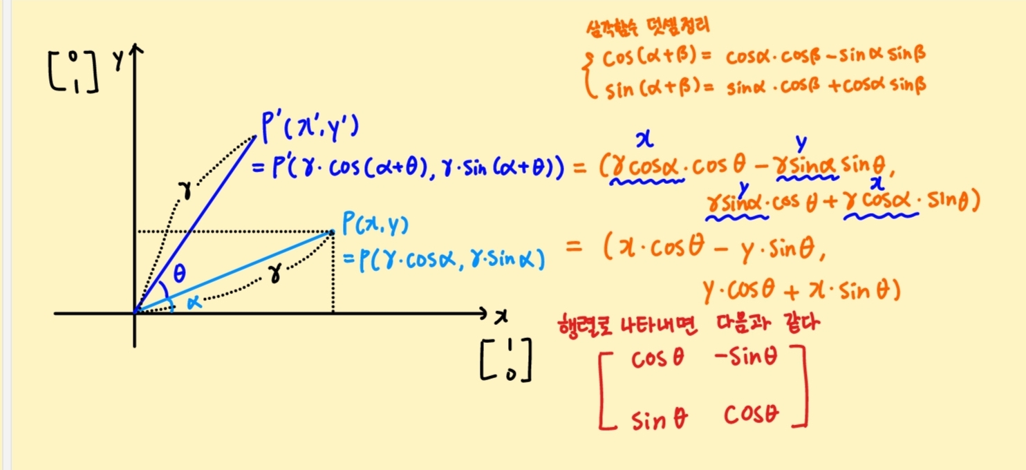 - 2차원에서의 회전은 원점을 기준으로 벡터를 회전시킨다. 회전은 벡터의 크기는 바꾸지 않기 때문에 이 성질과 삼각비를 사용해 간단하게 증명할 수 있다.