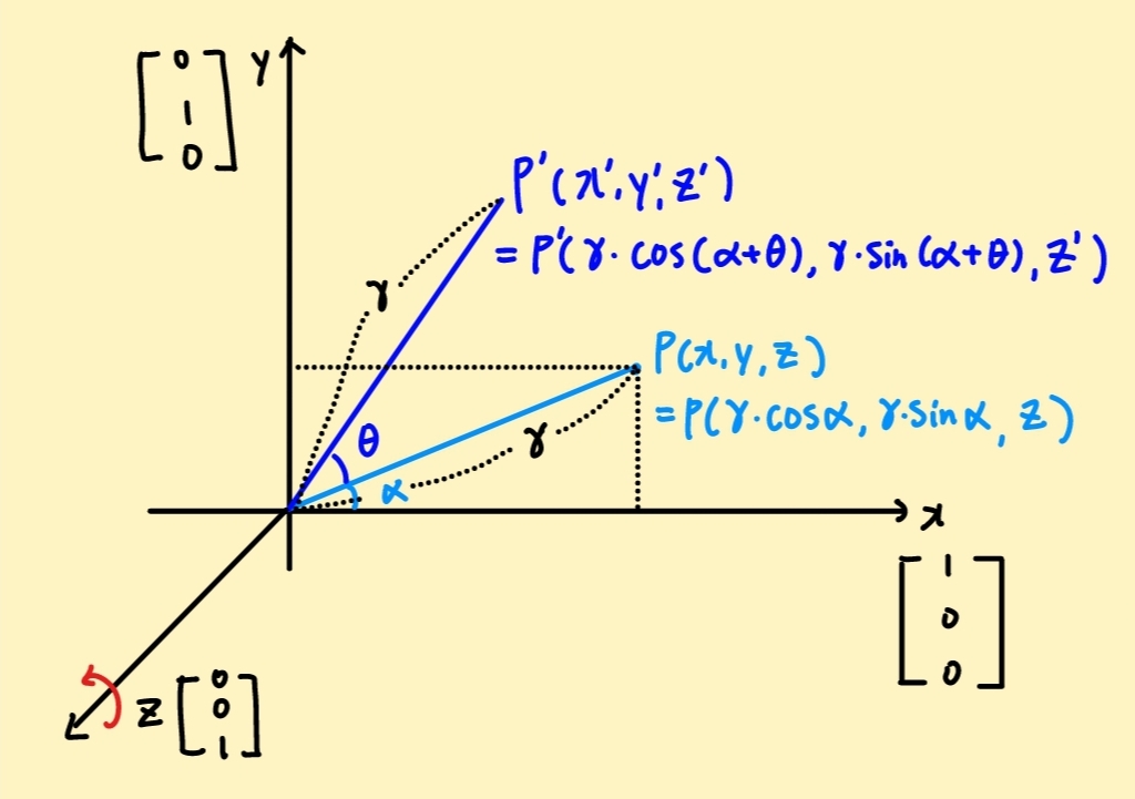 - 2차원에서는 원점을 기준으로 회전했다면, 3차원에서는 x,y,z축을 기반으로 회전한다. 각 축은 방향 벡터로 표현된다. 2차원 회전을 이해했다면, 그것을 바탕으로 축 회전 역시 이해하기 쉽다. 축에 해당되는 좌표값은 회전 이전, 이후에도 변하지 않기 때문이다.