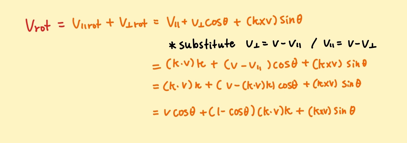k벡터는 회전할 축, v벡터는 회전시킬 벡터이다. k벡터는 크기가 1인 단위 벡터이다. 각 세타만큼 회전시켜 v rot벡터를 구할 것이다.