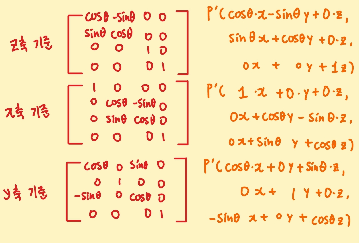 - 이를 바탕으로, x축, y축, z축 회전 행렬을 정리하면 다음과 같다. y축 회전이 다른 축 회전과 다른 배열을 가지는 이유는 회전되는 x축과 z축이 서로 대칭되지 않기 때문이고 이로 인해 sin값이 서로 반대 방향으로 scaling된다(하나가 +이면 다른 하나는 -이다).