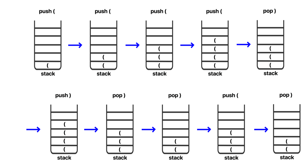 여는 괄호가 있을 때는 스택에 쌓고 닫는 괄호가 나오면 여는 괄호를 하나 pop 하여 0으로 만들어야 함