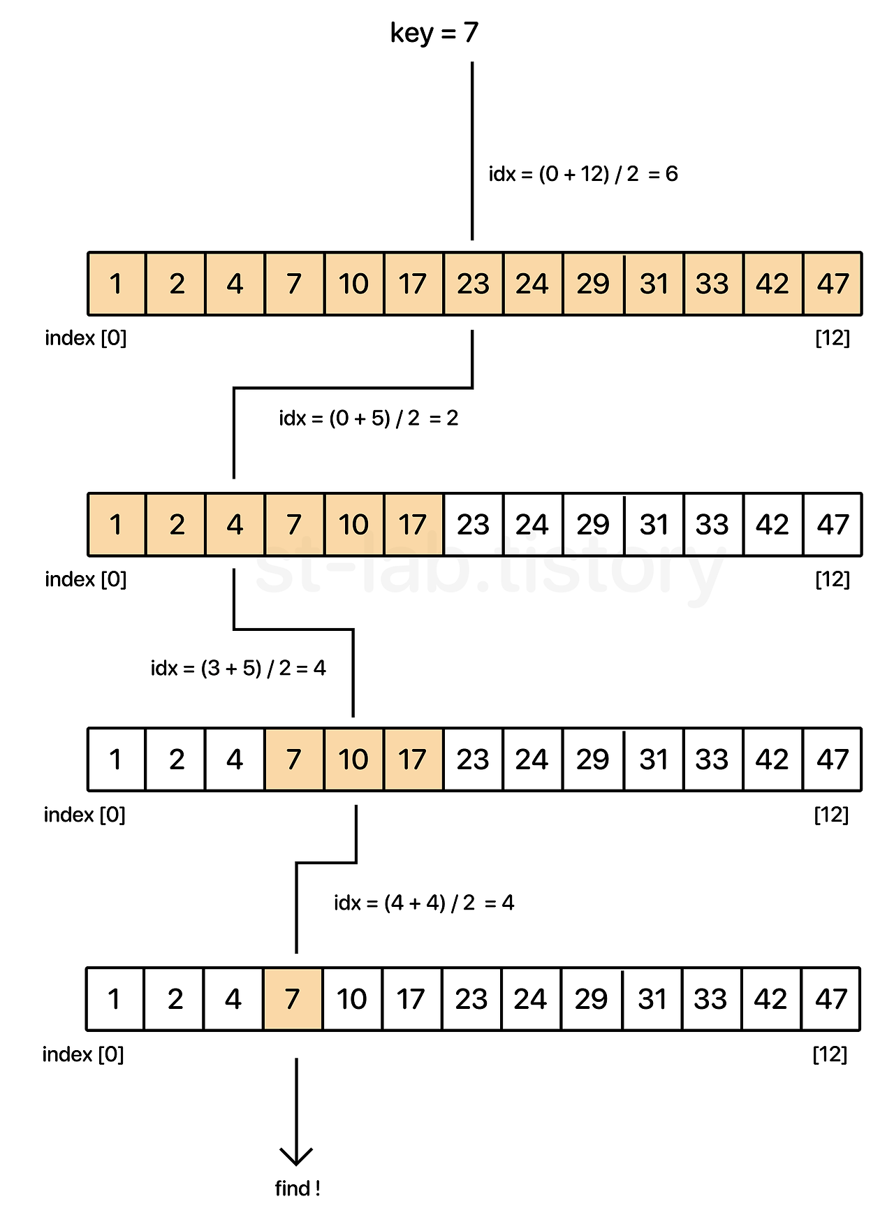 1부터 n 까지의 수를 전부 탐색하는 것이 아니라 mid (중간 값)을 구하고, key값이 중간 값과 일치하는지, 중간 값보다 작은지 아니면 더 큰지를 비교하여 크거나 작다면 다시 이등분 이등분 반복하여 key 값을 찾아나가는 방법을 말한다.