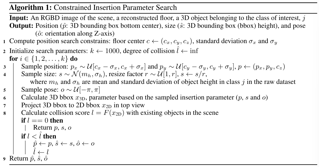 특히, 1) 물리적으로 실현 가능한 위치를 식별하고 삽입된 객체에 대한 pose를 취하여 기존 room 레이아웃과의 충돌을 방지함