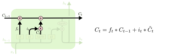- 이전 cell state인 C(t−1)를 업데이트해서 새로운 cell state인 C(t)를 만드는 단계