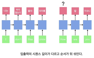 - many to many 번역 문제에서 기본적인 RNN 형태에서는 출력 길이를 조절할 수는 있지만 들어오는 문장마다 가변적일 수는 없음 -> 순서를 고려하기 쉽지 않음