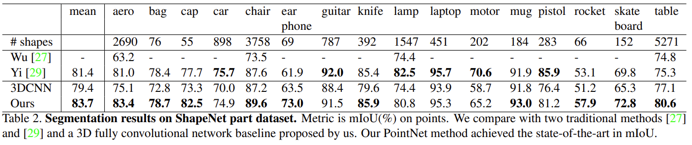 - 각 카테고리 C의 각 shape S에 대해서 shape의 mIoU를 계산한 후 카테고리별로 평균 냄 : mIoU는 겹치는 point개수로 계산함