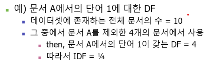IDF(Inverse Document Frequency): DF의 역수를 취한 값으로, 특정 단어가 전체 문서에서 얼마나 희소한지를 나타낸다.
