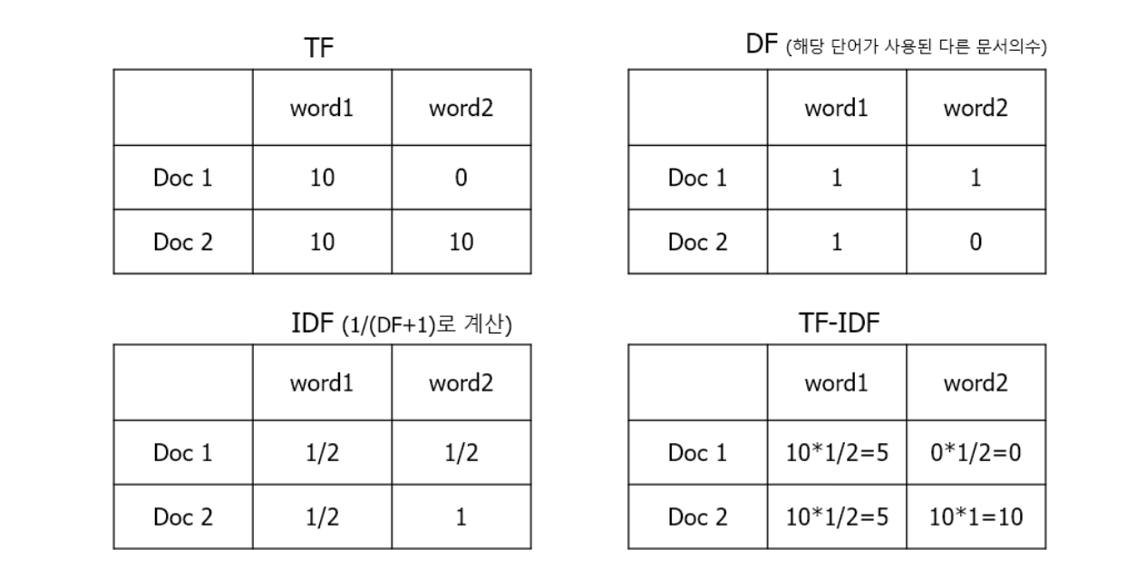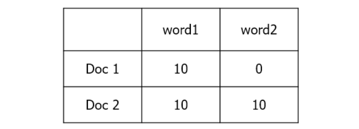 위의 예시에서 word1은 doc1, doc2에 모두 10회 등장하지만 doc1에서 상대적 중요도가 높다고 볼 수 있다.