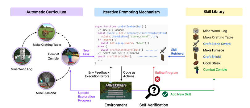 Voyager은 게임 Minecraft 환경에서 LLM을 기반으로 작동하는 지속적 학습 에이전트로 인간의 개입 없이 세계를 탐험하고, 다양한 기술을 습득하여 생존한다.