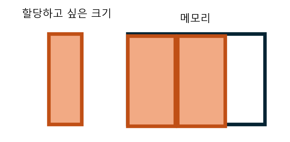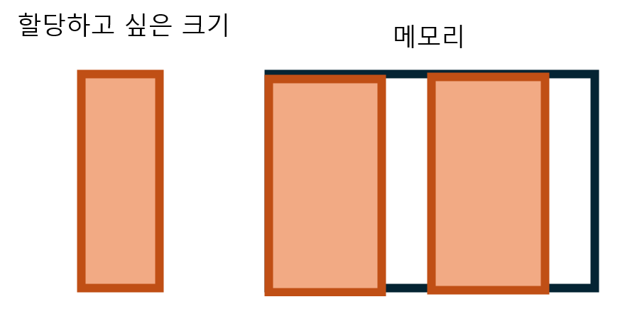 오른쪽은 메모리 공간이라고 봅시다. 그리고 왼쪽은 할당하고 싶은 크기라고 했을 때 메모리에 빈 공간이 있으므로 할당이 가능할 것입니다.
