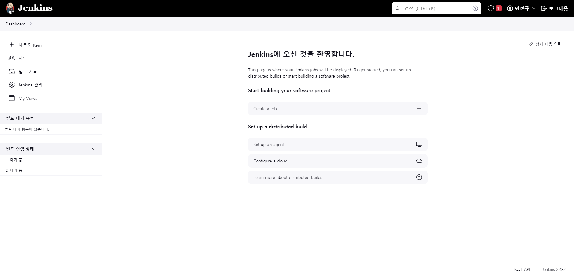 설치가 끝난 후 간단하게 회원가입을 완료하면 Jenkins 메인페이지를 볼 수 있다.