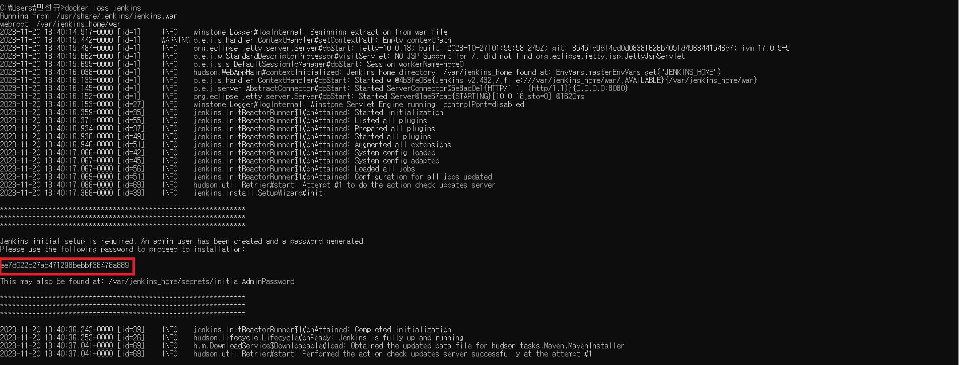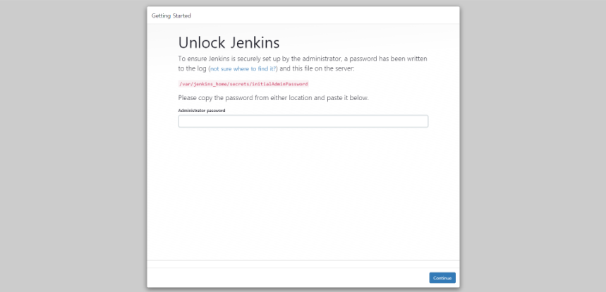 컨테이너를 실행하고 해당 포트에 접속하면 다음과 같은 비밀번호 입력 화면이 나오게된다. 해당 비밀번호는 Docker 로그를 통해 알 수 있다.