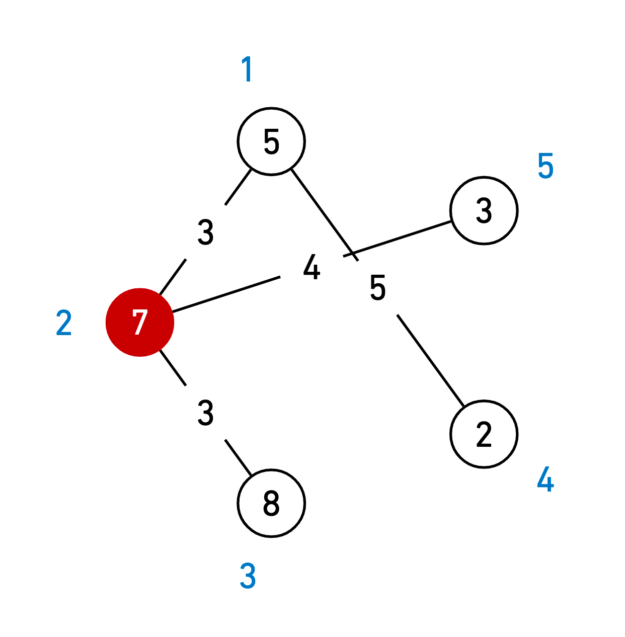 주어진 필드가 위의 그림과 같고, 예은이의 수색범위가 4라고 하자. ( 원 밖의 숫자는 지역 번호, 안의 숫자는 아이템 수, 선 위의 숫자는 거리를 의미한다) 예은이가 2번 지역에 떨어지게 되면 1번,2번(자기 지역), 3번, 5번 지역에 도달할 수 있다. (4번 지역의 경우 가는 거리가 3 + 5 = 8 > 4(수색범위) 이므로 4번 지역의 아이템을 얻을 수 없다.) 이렇게 되면 예은이는 23개의 아이템을 얻을 수 있고, 이는 위의 필드에서 예은이가 얻을 수 있는 아이템의 최대 개수이다.