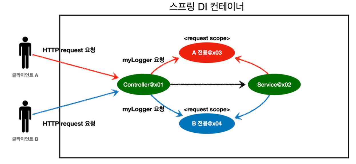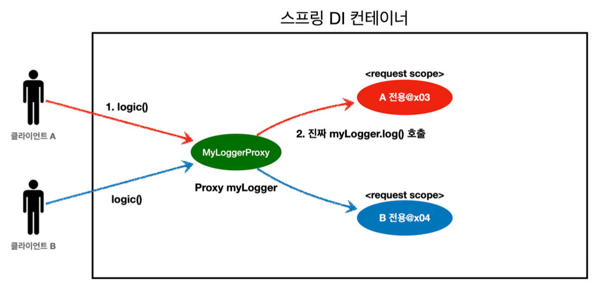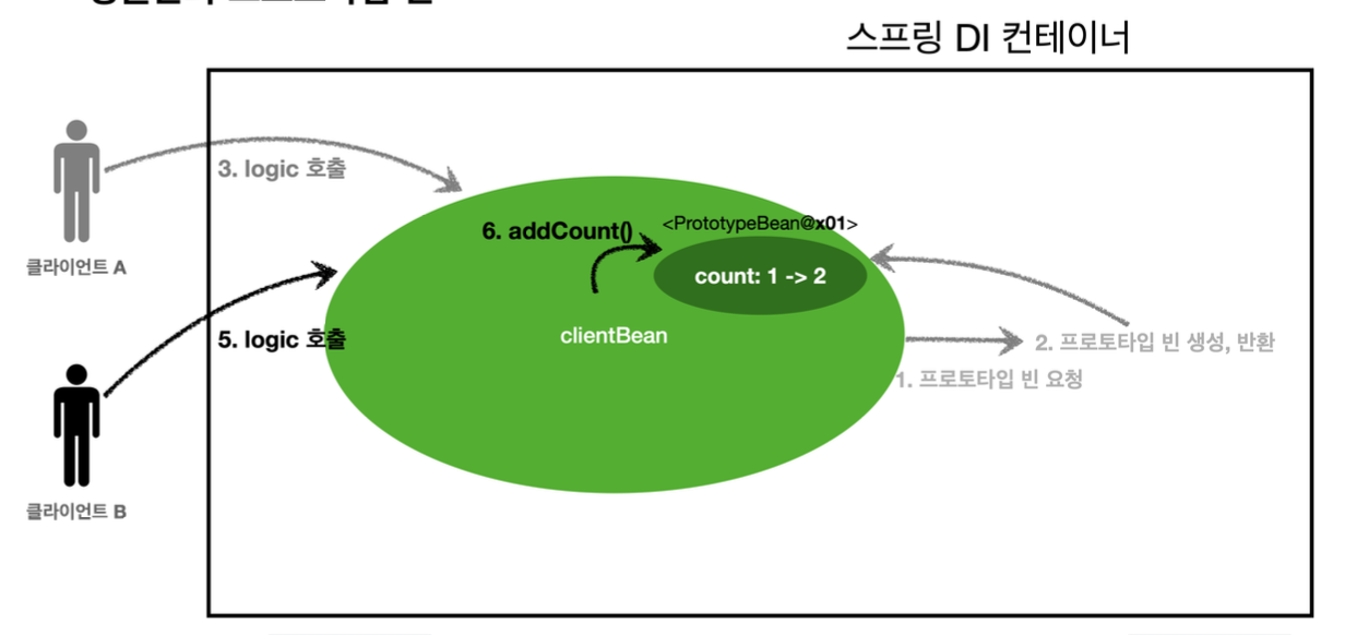 클라이언트 A, B는 같은 빈을 사용하고 (싱글톤이므로), 프로토타입 빈은 이미 과거에 주입된 빈으로 계속 같은 것을 사용함(로직 호출마다 프로토타입빈 새로 생성 X)
