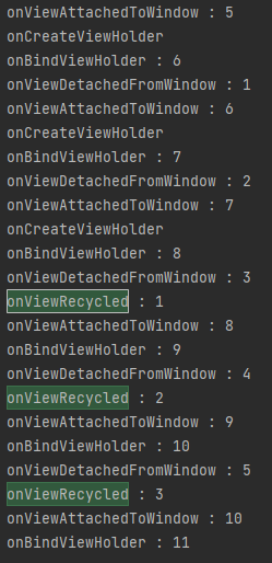 RecyclerView에 어댑터를 set 하면 onAttachedToRecyclerView가 호출되고 처음 화면에 보이는 뷰홀더 갯수만큼 onCreateViewHolder, onBindViewHolder, onViewAttachedToWindow가 호출된다.