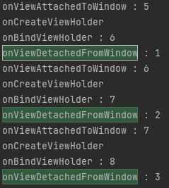 맨 처음 스크롤하기 전과 다른 점은, 5, 6, 7, 8번째 아이템이 추가되면서 밀려 올라가 보이지 않는 1, 2, 3번째 뷰홀더가 차례로 detach 된다는 점이다.