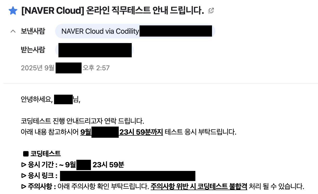 서류 합격과 동시에 Codility에서 응시 안내 메일을 받았다. 가려놓긴 했지만 받은 날로부터 남은 시간 + 72시간 안에 응시해야 했다.