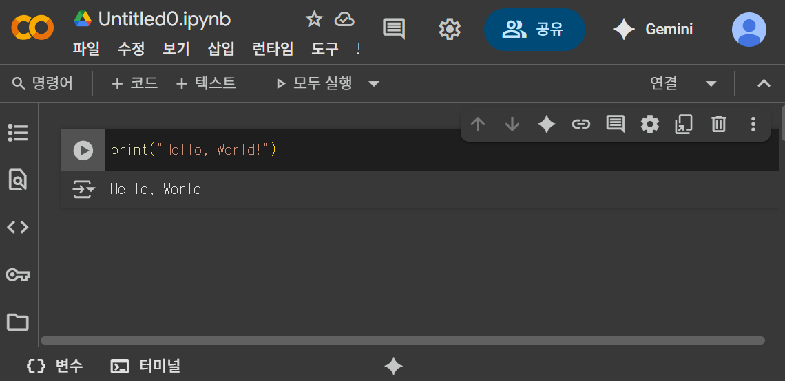 저는 Google Colab에서 Python부터 시작했습니다.단순히 print(”Hello,world!”) 한 줄이었지만 “내가 직접 코드를 실행해 출력을 했다.”는 작은 성취감이 저를 계속 앞으로 나아가게 했습니다.