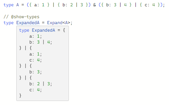 type A = ({ a: 1 } | { b: 2 | 3 }) & ({ b: 3 | 4 } | { c: 4 });