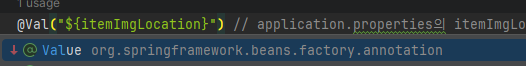7. itemService ์์ itemImgService.updateItemImg() ๋ฉ์๋ ์ํ. ์ด ๋, ํ๋ผ๋ฏธํฐ๋ "์ํ ์ด๋ฏธ์ง์ id", "์ํ ์ด๋ฏธ์ง ํ์ผ"