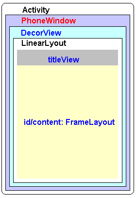Activity는 attach()에서 PhoneWindow 객체 생성. 이 PhoneWindow는 액티비티내 뷰들의 root로서 DecorView 인스턴스 포함.