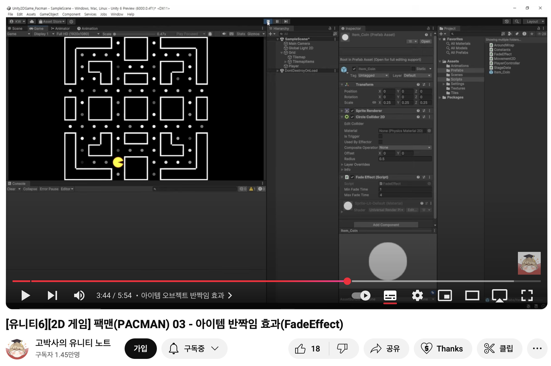 [유니티6][2D 게임] 팩맨(PACMAN) 03 - 아이템 반짝임 효과(FadeEffect)