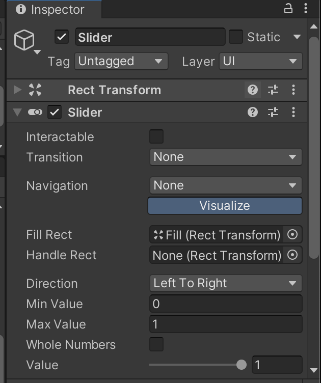 먼저 UI > Slider를 생성해주고, Handle은 체력바를 구현할 때 필요없으므로 삭제해줍니다.
