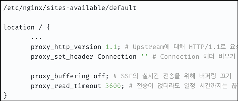 Nginx 설정 수정: SSE 통신에 적합하도록 Nginx 설정을 다음과 같이 수정했습니다.이 설정들은 Nginx를 통과하는 SSE 연결 자체의 안정성을 높이는 데 필수적입니다. 하지만 이 역시 애플리케이션 내부의