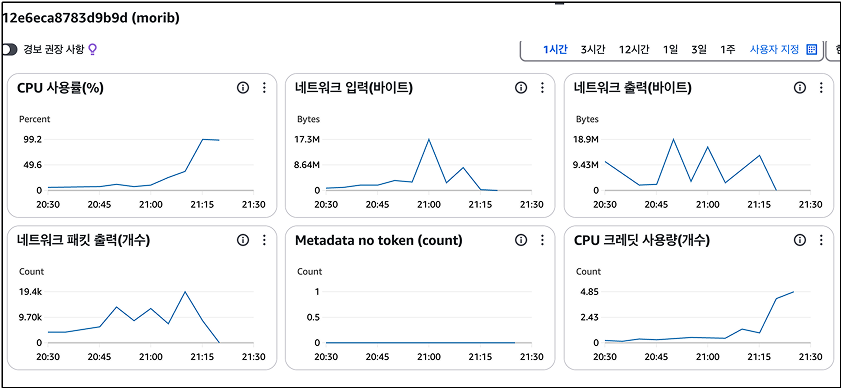 발생을 알렸고, OOM은 잦은 서버 다운으로 이어져 서비스가 상당히 불안정했습니다. 이에, CPU 사용 100%까지 달성했습니다.
