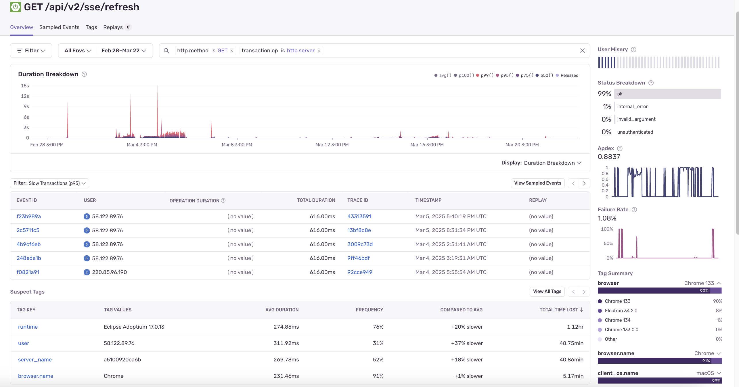 API의 성능 지표 역시 좋지 않았습니다. Sentry 기준으로 p95 응답 시간이 600ms를 초과하는 경우가 빈번했습니다.
