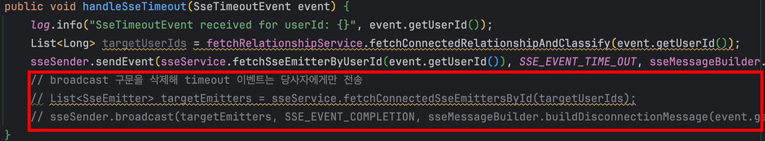 수정 시도: 타임아웃 시 불필요한 broadcast 로직을 제거하고, 타임아웃이 발생한 당사자에게만 관련 이벤트(예: 연결 종료 알림 또는 재연결 유도)를 보내도록 handleSseTimeout