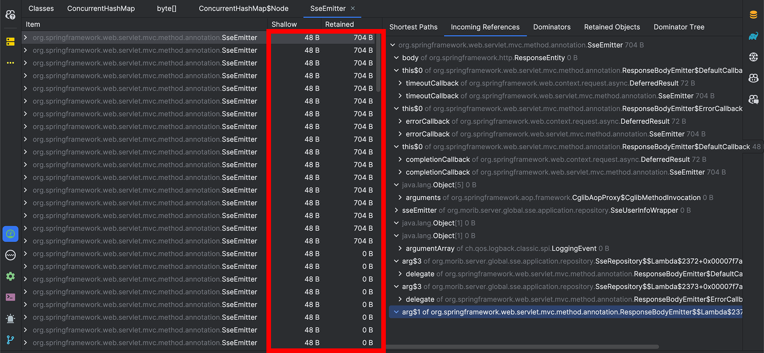 객체들이 메모리에 남아있는 것을 확인할 수 있었습니다. 이는 SseEmitter
