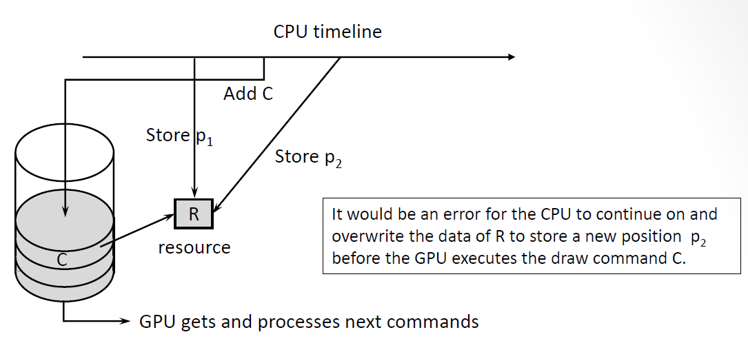 GPU가 리소스를 처리하고 있을 때, CPU가 접근을 하면 예상치 못한 동작이 발생할 수 있다. 이가 race condition이며, 이를 막기위해 GPU가 작업을 다 끝낼때까지 CPU가 리소스를 건들지 못하게 막을 수 있다.