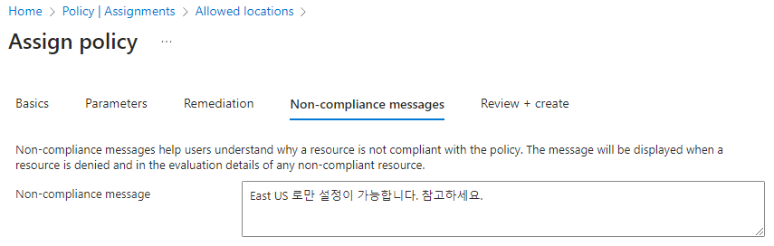 위와 같이 East US 이외의 Region을 설정하면 Policy에서 작성한 Non-compliance messages 가 표출됩니다.