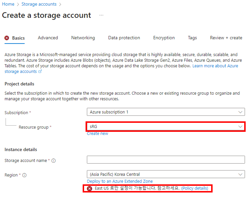 이제 정책이 제대로 등록되었는지 Resource Group에 Storage accounts를 추가해보겠습니다. 좌측 메뉴에서 Storage accounts > Create 를 클릭합니다. Resource Group 을 sRG로 선택하고 Region을 East US가 아닌 다른 지역을 선택해 봅니다.