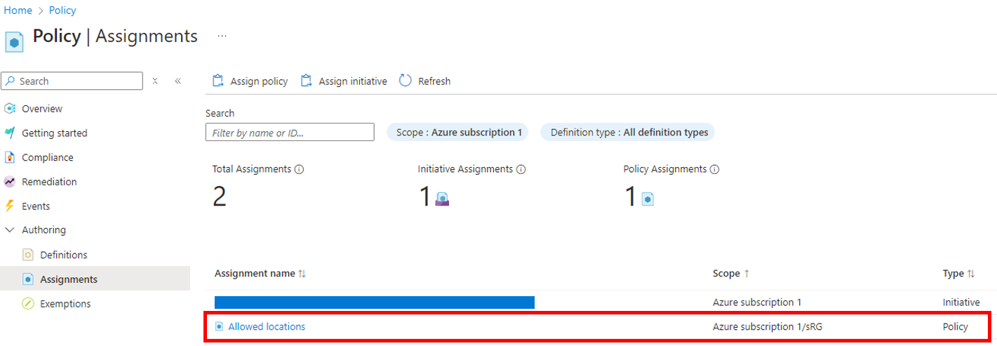 Create 를 눌러 Policy 를 생성합니다. 이제 Policy > Compliance 를 선택하면 Allowed locations 정책이 추가된 것을 확인할 수 있습니다.