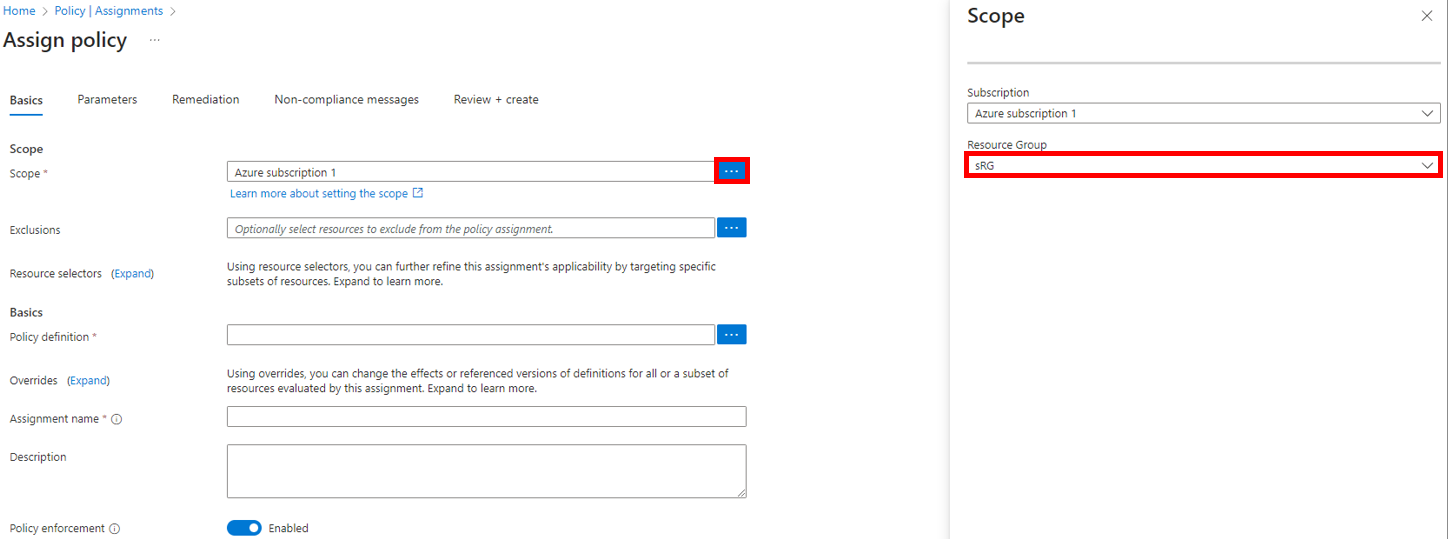 Scope 옆 ...을 눌러 Resource Group을 sRG 로 선택하고 select > Next 를 클릭합니다.