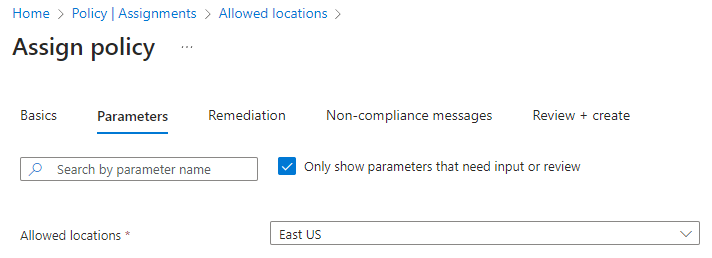Parameters 탭에서는 Allowed locations 를 East US 을 선택합니다.